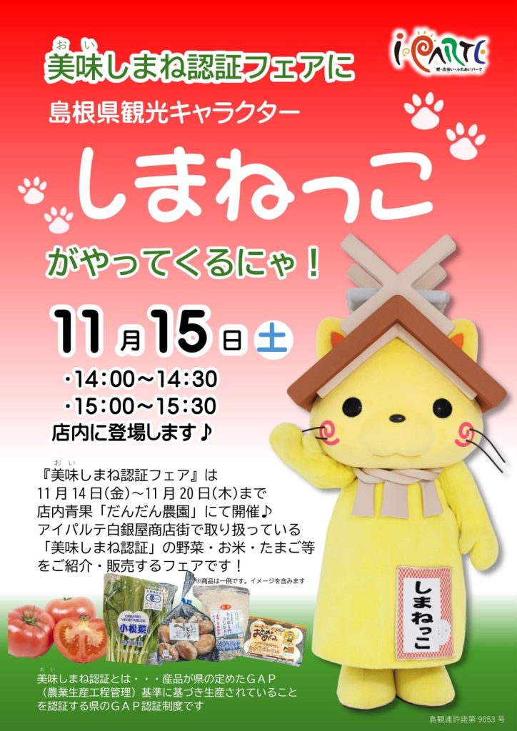 11/15㈯島根県観光キャラクター「しまねっこ」がやってくるにゃ🐾