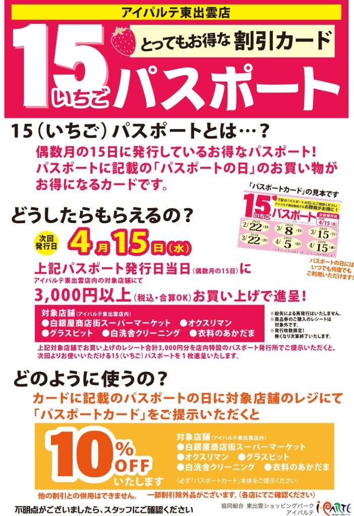 いちごパスポートに記載された日にレジにていちごパスポートをご提示いただくと、お買い上げ金額から10%OFFいたします。