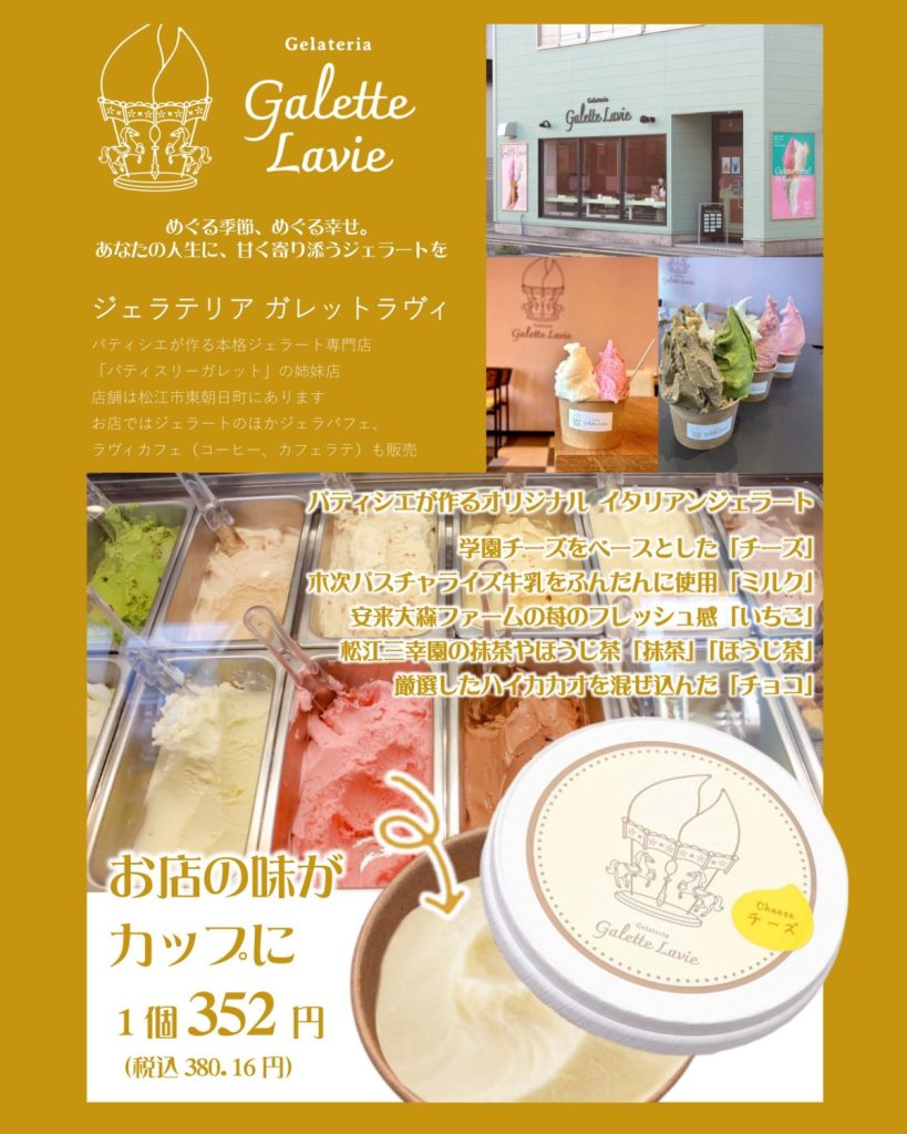松江市東朝日町のジェラート店「ガレットラヴィ」のカップジェラートを販売しております!パティスリーガレットの姉妹店で、パティシエの作る本格イタリアンジェラートのお店です。