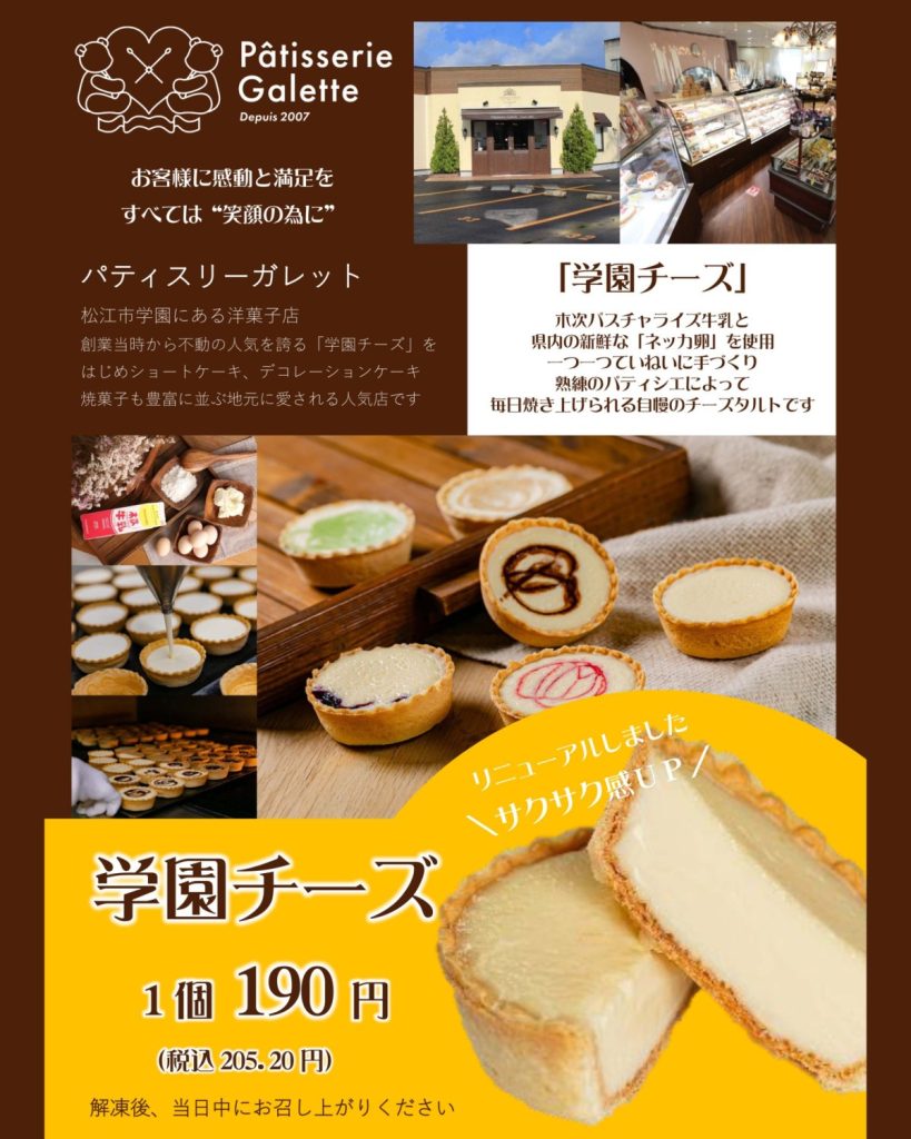松江市学園の洋菓子店「パティスリーガレット」の看板商品「学園チーズ」を、冷凍販売しております!アイパルテで手軽にお一つからご購入いただけます。冷凍なのでお日持ちします。冷蔵庫や常温で解凍してお召し上がりください。解凍後は当日中にお召し上がりください。