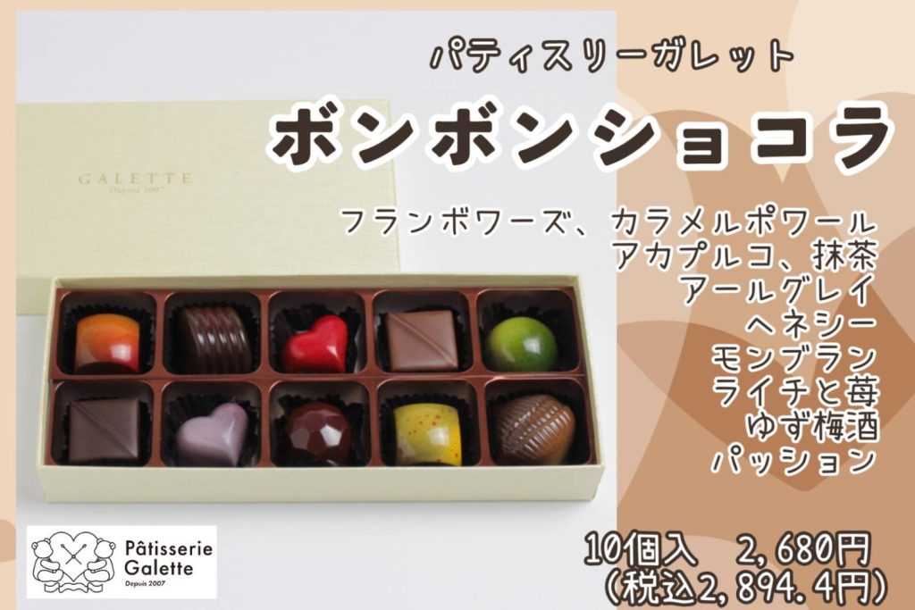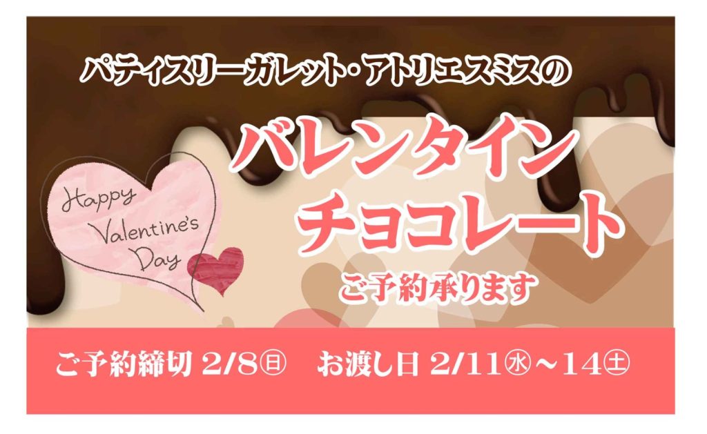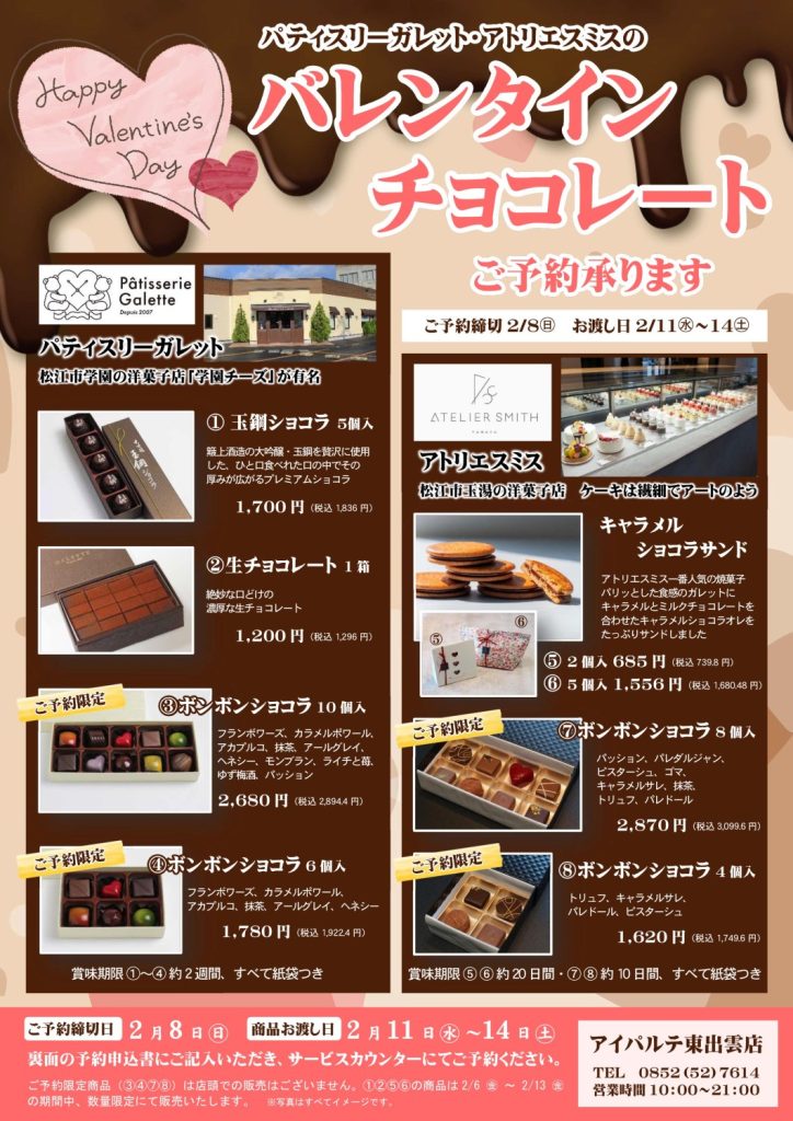 松江市学園の洋菓子店「パティスリーガレット」、松江市玉湯の洋菓子店「アトリエスミス」のバレンタイン♥チョコレートのご予約を承ります!