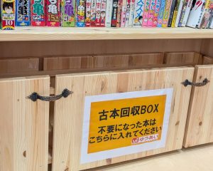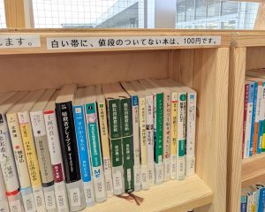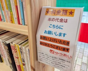 値段のついていない本はすべて100円、値段のついている本はその金額を、本棚横の「料金箱」へ入れてください。また古本回収BOXも設置されていますので、ご家庭でご不要になった本を入れてくださいね。