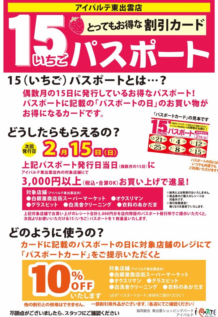 いちごパスポートに記載された日にレジにていちごパスポートをご提示いただくと、お買い上げ金額から10%OFFいたします。